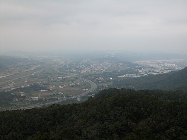 山下兩條溪谷匯集成的平原,一條是西湖溪另一條是後龍溪。而前方不遠房子最密集的地方就是銅鑼市街,更遠幾乎在天邊的那一坨密密麻麻的房子就是苗栗市區了。中山高速公路在眼前來個 S 形的大轉彎,往海的方向看,通宵火力發電廠的大煙囪都看得見。